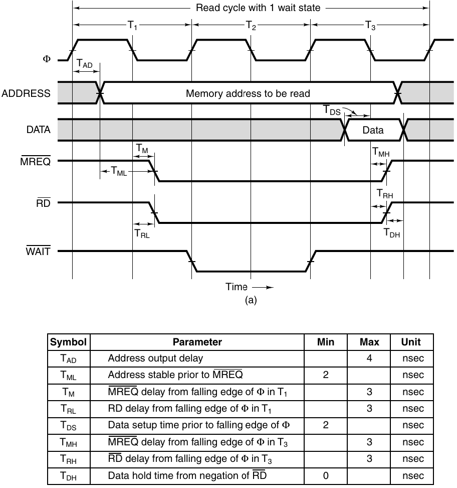 - MREQ requires 2 conditions: (a) T_{ML} has passed since address is stable, and (b) T_{M} has passes since the falling edge of the first cycle.